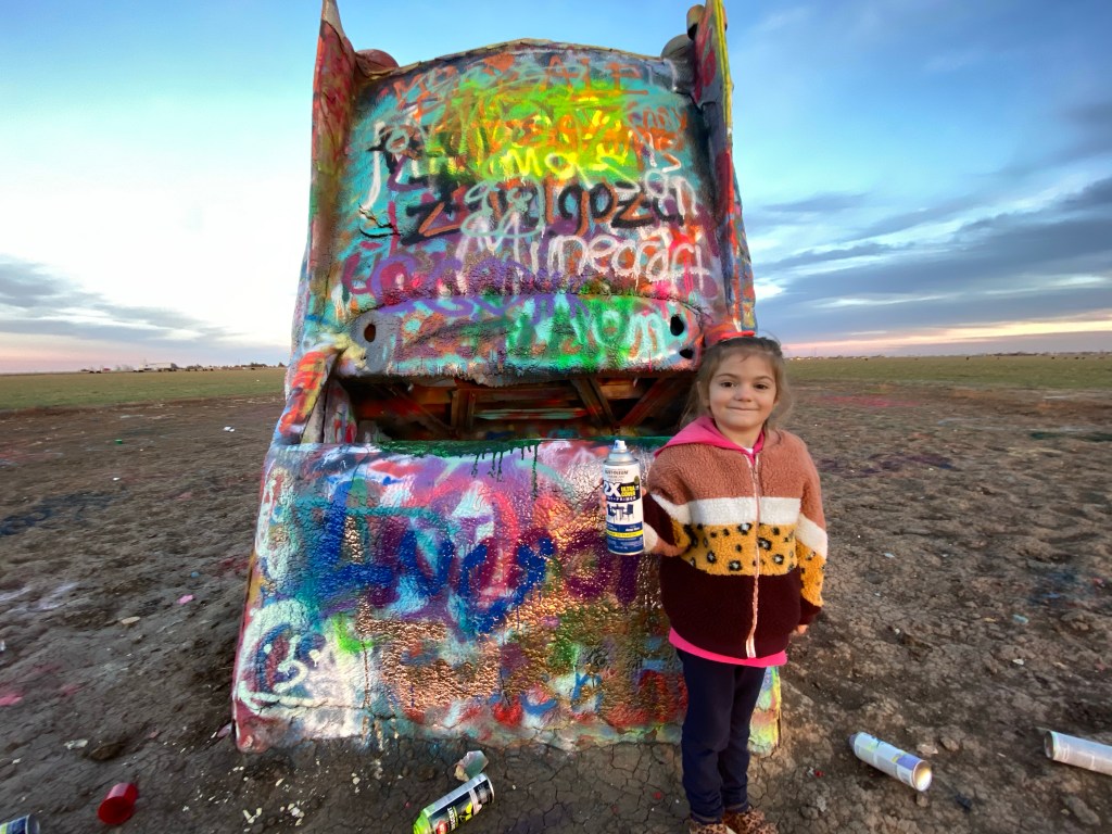 Lucy was able to use spray paint for the first time at Cadillac Ranch. I think we have a graffiti artist in the making. Found some unexpected dinosaurs in Clayton and Tucumcari, NM.